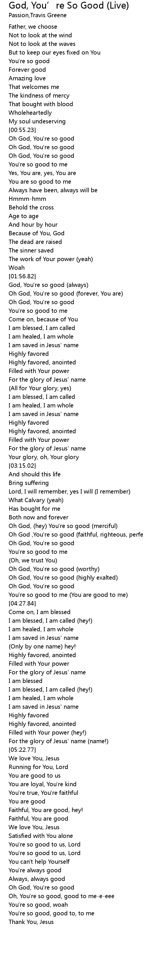 You're kinda small And your such a doll I'm glad you're mine You're so good to me How come you are You take my hand And you understand When I get in a bad mood You're so good to me And I love it, love it You're my baby, oh yeah Don't mean maybe, oh yeah I know your eyes Are not on 'ther guys When we're apart You're so true to me How come you are And every night You hold me soPassion – God, You're So Good (Live/Lyric Video) ft Kristian Stanfill, Melodie Malone – Passion Lyrics Singer Passion Song Writer Brett Younker, Brooke Ligertwood, Kristian Stanfill, Scott Ligertwood Amazing love That welcomes me The kindness ofDescription This download is for the song God You're So Good It includes the Full and Instrumental tracks paired with a traditional style lyric video that will make a great addition to any worship setting Song Lyrics Amazing love that welcomes me The kindness of mercy That bought with blood wholeheartedly My soul undeserving God You're so good